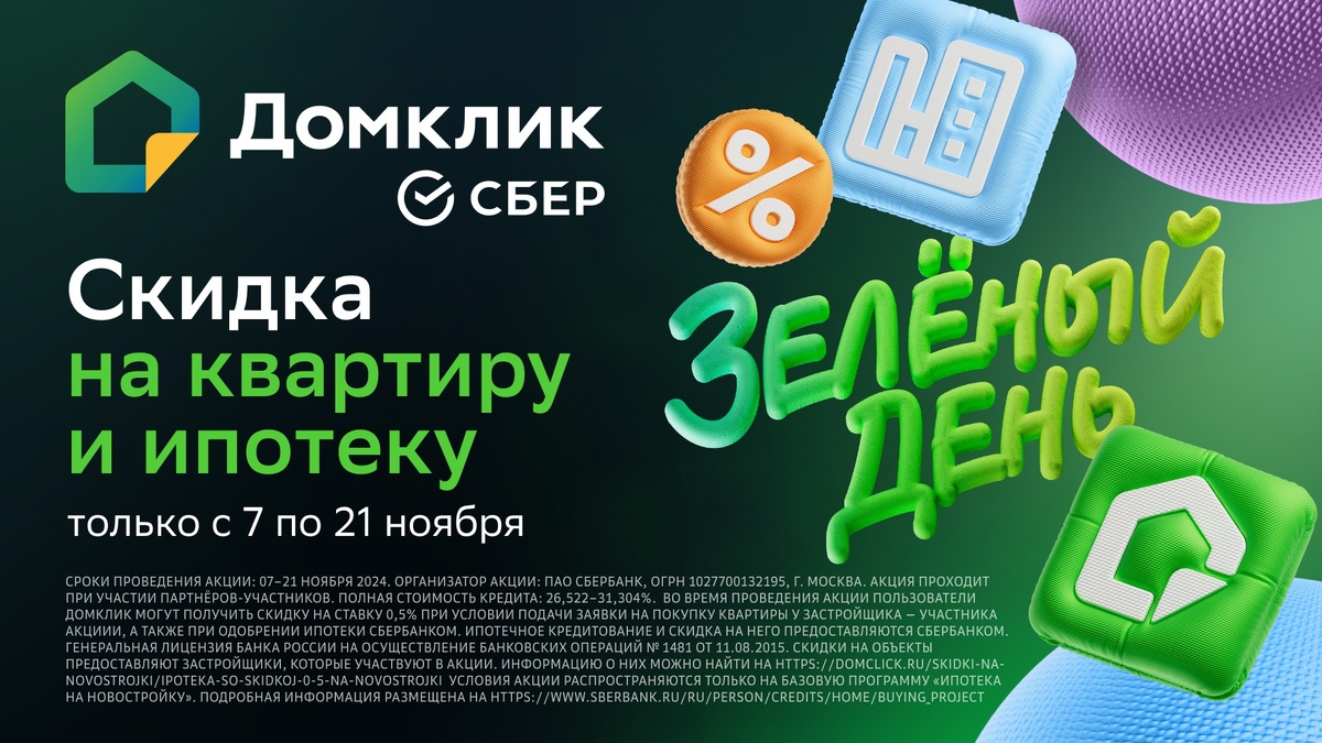 Спешим сообщить вам отличную новость! Зеленый день в СберБанке! При покупке квартиры с 7 по 21 ноября 2024 года, вы можете принять участие в акции «Зеленый день». Менеджер Отдела Продаж поможет выбрать и забронировать квартиру со специальной скидкой, которая действует только в период акции. Также вы сможете получить скидку на ставку 0,5% от Сбера. За подробностями обращайтесь по телефону +7 (473) 280-08-44 Сайт: ЖК "Новая Ведуга" Ипотечное кредитование и скидка на него предоставляются СберБанком. Генеральная лицензия Банка России на осуществление банковских операций № 1481 от 11.08.2015.
