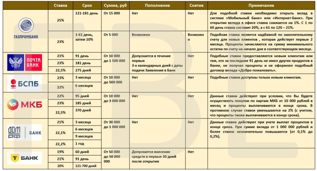 На фото ниже прикрепили для Вас обобщенную информацию по текущим депозитам у банков и краткие условия по ним. Постарались выбрать самые привлекательные!