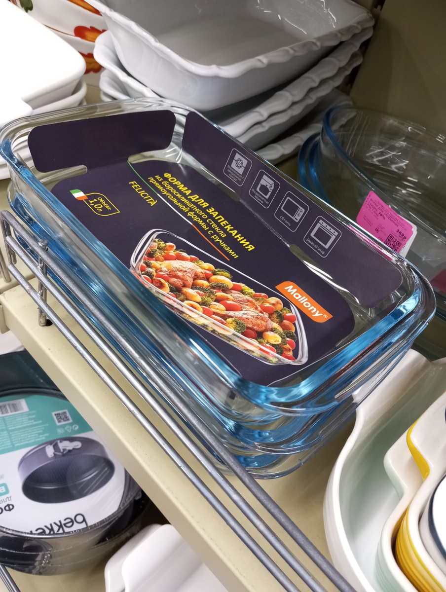 В магазинах Familia я не частый гость. Конечно, ассортимент большой, очень много одежды, чуть меньше обуви, есть и товары для дома, всё это замечательно. И то, что качественные брендовые вещи можно встретить, это прекрасно. Но здесь нет порядка, всё выставлено вперемешку, сложно найти что-то стоящее. И даже если повезло найти вещи любимого бренда, то легко может оказаться, что модель есть только в единичном экземпляре и какого-то непонятного размера. Нет, не буду отрицать, пара приятных покупок у меня состоялась. Но, я бы сказала, что это была большая удача. В сегодняшнем обзоре я хочу показать вам не вещи, а предметы быта, товары, которые могут быть полезны на кухне, в ванной или пригодятся для украшения интерьера. Давайте вместе пройдёмся по магазину и посмотрим, что есть в продаже и по какой цене. Форма прямоугольная из боросиликатного стекла, объём формы 1 литр. Может использоваться в духовке, в микроволновой печи, в морозилке. Цена 449 руб. Хлопковый плед размером 125х150 см, у