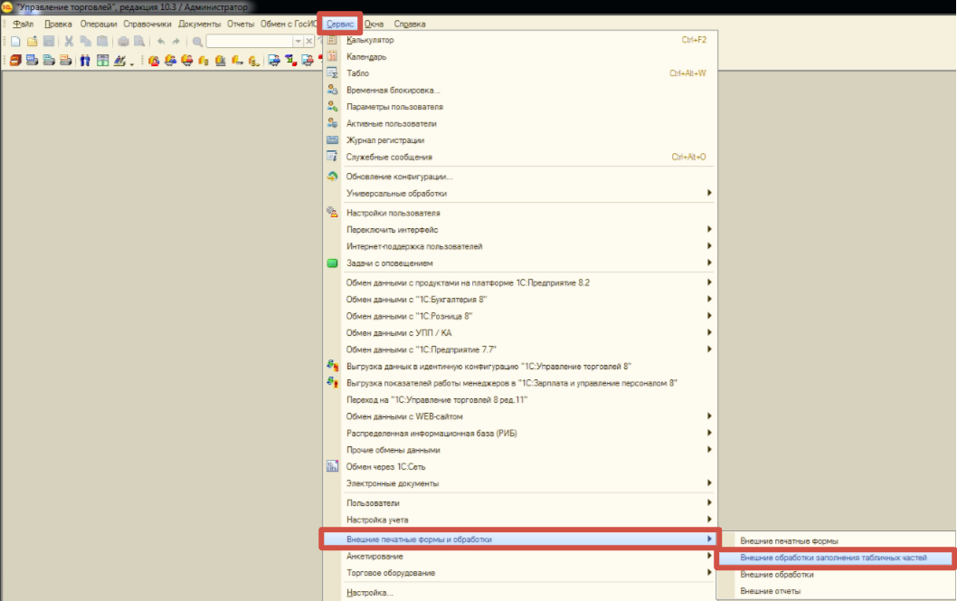 Для того, чтобы добавить обработку в программу, заходим во вкладку «Сервис» - далее «Внешние печатные формы и обработки» - «Внешние обработки заполнения табличных частей»: