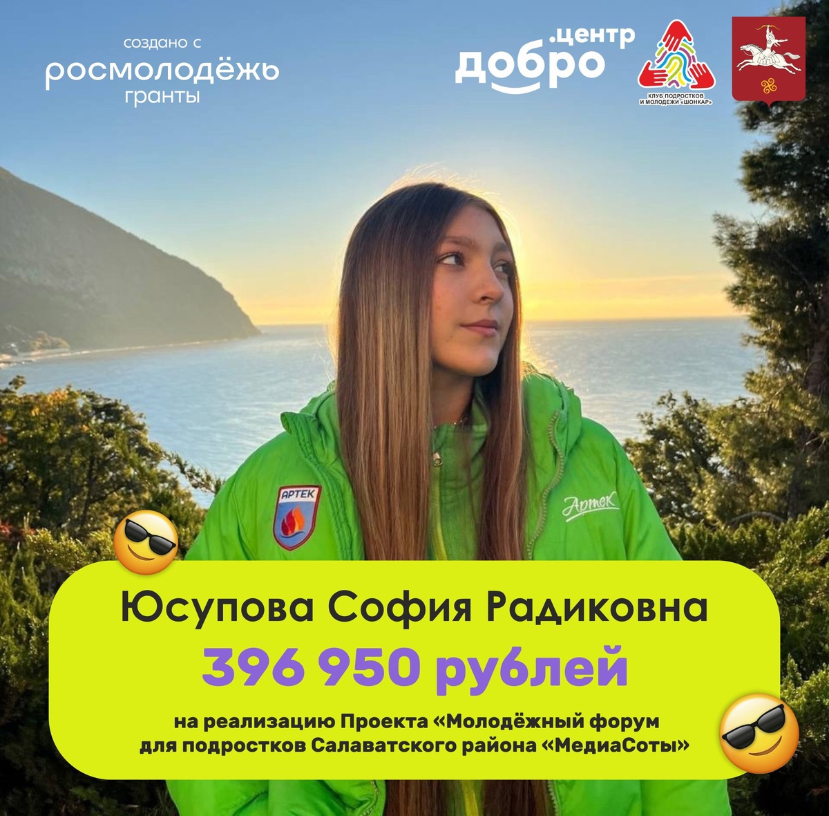 Проект учащейся Малоязовской башкирской гимназии Софии Юсуповой «МедиаСоты» получил грантовую поддержку в размере 396 950 рублей на Всероссийском конкурсе молодежных проектов от Росмолодёжь.Гранты.