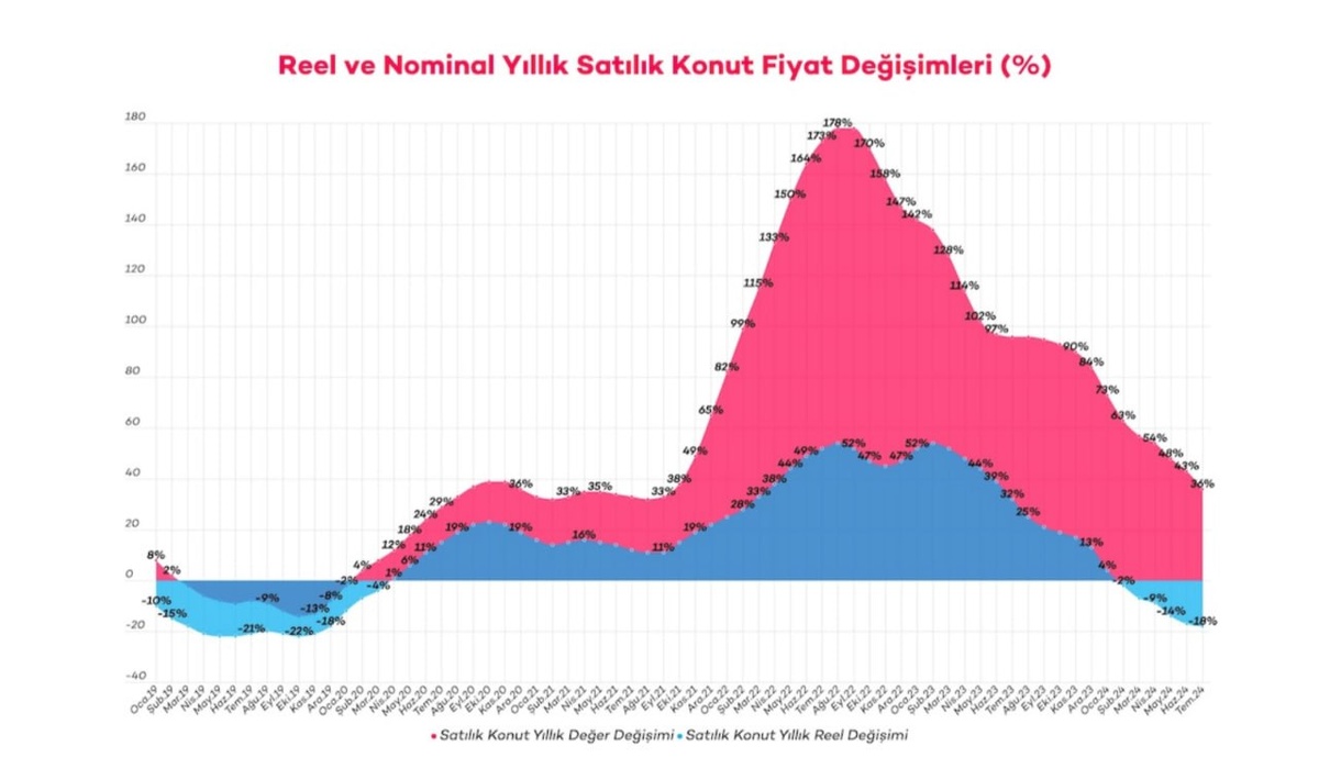 По данным Endeksa, которая предлагает оценку недвижимости с помощью технологий искусственного интеллекта, по состоянию на июль 2024 года цены продажи недвижимости в Турции выросли на 36% в годовом исчислении, в то время как замедление темпов роста продолжается. Если данные скорректировать с учетом инфляции, видно, что цены на жилье на продажу снизились на 18% в реальном выражении по сравнению с тем же месяцем прошлого года. Генеральный директор и соучредитель Endeksa Гёркем Огют подчеркнул, что рост цен на дома, выставленные на продажу, номинально достиг допандемического уровня. Он отметил: Переговорная сила покупок за наличные очень высока, поэтому сейчас самое время покупать недвижимость