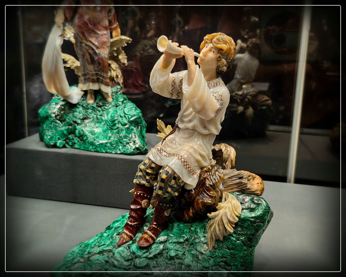 "Данила-Мастер" создан и необычно, и очень узнаваемо. Каменный Цветок в этот раз выточен из светлого агата, и посверкивает кристалликами. Фигура Данилы-Мастера кажется самой реальной на фоне полупрозрачных камней, которые не просто окружают его - они символизируют иной мир. Но самым, пожалуй, необычным в этой композиции можно назвать Хозяйку Медной Горы - она словно незримо присутствует рядом с Мастером, наблюдая за его работой (листайте вправо)