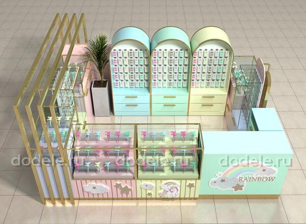 Только посмотрите на это чудо! Какой милый кукольный домик у нас получился. А это полноценный торговый остров по продаже заколок и аксессуаров для волос. Торговый остров оборудован вместительными многоуровневыми витринами с накопителями, удобной зоной примерки с поворотным зеркалом, кассовым модулем и стойкой обслуживания клиентов. Внешний вид торгового оборудования притягивает взгляды не только юных модниц, но и взрослых девчонок без ограничения по возрасту. Остров оборудован яркой подсветкой и фирменным логотипом. Цветовое решение - несколько пастельных оттенков, но в то же время достаточно ярких для приметности торговой конструкции. Особое внимание мы уделили деталям - добавили на фасад декоративные световые элементы - блестящие звездочки, облачка, фигурки единорога. Престиж торговой марки и качество изделий подчеркивают золотые рамки и абрисы. Создаётся ощущение, что данному бренду можно доверять на все 100%. Отдельно отметим, что сам остров состоит из достаточно вместительных витр