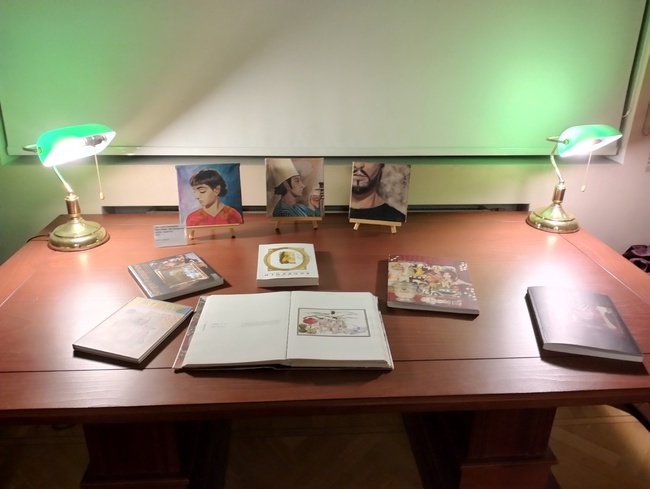 Не решилась сфотографировать лектора и зал, а жаль. Такие необычные, одухотворённые лица. Думаю, Параджанов тут же пригласил бы аудиторию в своё кино. Центр восточной литературы очень уютный и люди там изысканно вежливые, встречают улыбками, как самую дорогую гостью. Эта изысканность гармонирует с убранством, с выставкой «Цвет граната», посвященной столетию Параджанова. Там много детских рисунков - пёстрых, как восточные сказки. Не все из них раскрашенные, некоторые графические, но такие замысловатые и ажурные, что тоже наводят на мысль о красных цветах граната. В творчестве Параджанова много необычной эстетики, древних символов в современной интерпретации. Он любуется красивыми вещами, красивыми людьми, красивыми движениями. Через вещный, чувственный, осязаемый мир постигает нечто невыразимое, невидимое, тонкое. Напоминает Оскара Уайльда - как о нем написал Корней Чуковский, только с более пряным национальным (не всегда армянским, бывает - гуцульским) колоритом. Два самых известных ф