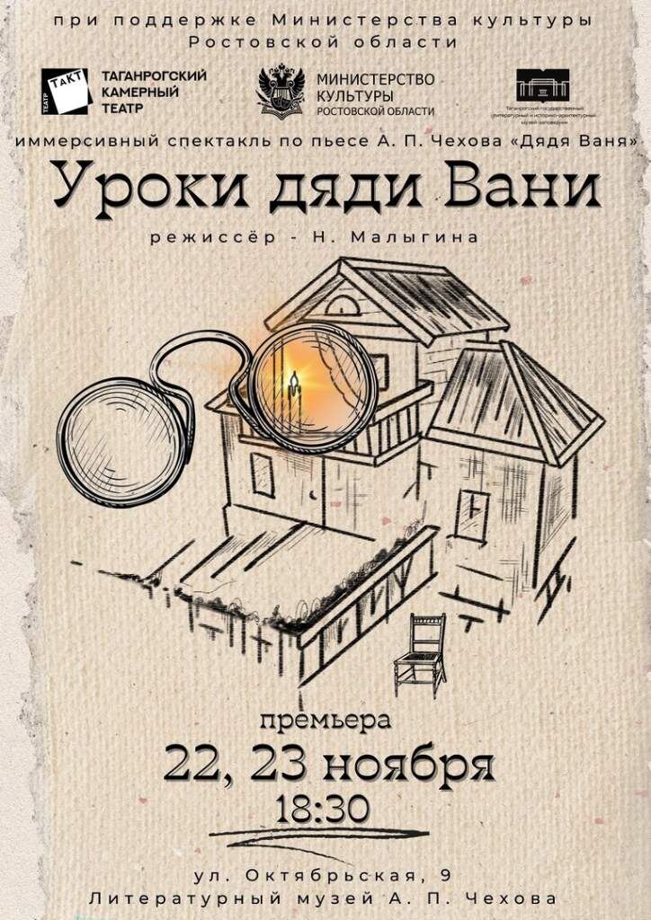 Театр «ТаКТ» в скором времени представит премьерный спектакль «Уроки дяди Вани» по пьесе Антона Павловича Чехова. Режиссёр — Нонна Малыгина. Спектакль, созданный по законам иммерсионного (immersion, англ. переводится как «вовлечение», «погружение») театра, предлагает непосредственный контакт актеров и зрителей для более эмоционального погружения в действие. «Дядя Ваня» — одна из самых щемящих и вместе с тем лиричных русских семейных историй. В провинциальной глуши чеховские персонажи мечтают вырваться из унылой повседневности, размышляют о долге, совести и чести, задаются вопросами предназначения человека. В мире героев пьесы много любви и много страданий. «Те, которые будут жить через сто, двести лет после нас… быть может, найдут средство, как быть счастливыми…». «Те, которые будут жить через сто — двести лет после нас и для которых мы теперь пробиваем дорогу, помянут ли нас добрым словом?» © А.П. Чехов «Дядя Ваня» О чём задумается зритель спустя 128 лет после написания пьесы? Какие