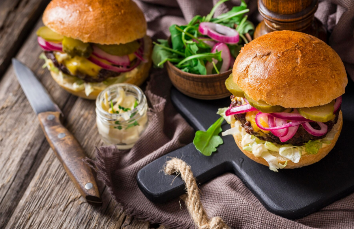 Бургеры — это одно из самых популярных и универсальных блюд в мире. Они могут быть как быстрым уличным перекусом, так и настоящим гастрономическим наслаждением. В этом рецепте мы расскажем, как приготовить домашние бургеры с сочными мясными котлетами, свежими овощами и мягкими булочками. Приготовив этот бургер, вы точно не захотите возвращаться к покупным вариантам. Для котлет: Для соуса: Для бургера: Для начала займемся котлетами. Возьмите мясо и, если вы используете не готовый фарш, нарежьте его мелкими кусочками. Сначала приготовьте лук и чеснок: очистите и мелко нарежьте лук, чеснок можно пропустить через пресс или также мелко нарезать. Лук придаст котлетам сочность, а чеснок — пикантность. В глубокой миске смешайте фарш, нарезанный лук, чеснок, яйцо, хлебные крошки (или панировочные сухари), добавьте соль и перец по вкусу. Хорошо перемешайте все ингредиенты, пока масса не станет однородной. Если фарш слишком жидкий, добавьте немного хлебных крошек, чтобы сделать его более плотным.