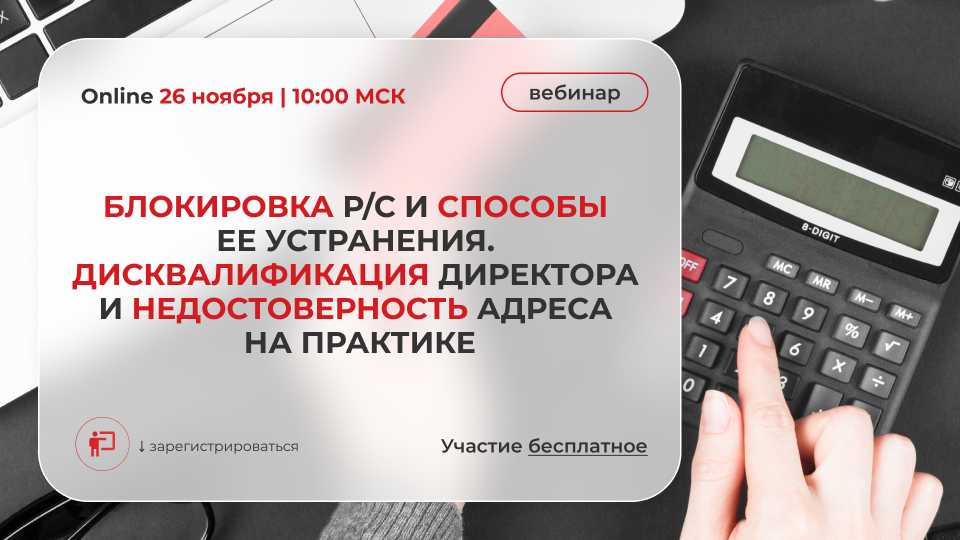 Приглашаем принять участие в вебинаре! Тема вебинара: "Блокировка р/с и способы ее устранения. Дисквалификация директора и недостоверность адреса на практике" Дата и время: 26.11.2024 в 10:00 (МСК) Для кого: работающие ИП и ООО, которые могут столкнуться с проблемами блокировок счетов от ФНС, приостановки деятельности по различным дисквалификациям и записям о недействительности юридически значимой информации. Зачем участвовать: Участие бесплатное. Подробно разбираем реальные кейсы: Квалифицированные специалисты поделятся своим реальным опытом по решению сложных задач, которые приостанавливают работу бизнеса на долгое время. Вопросы вебинара: ✔️ Блокировка р/с ФНС. Как оперативно проверить по какой причине заблокировали счет. Что д