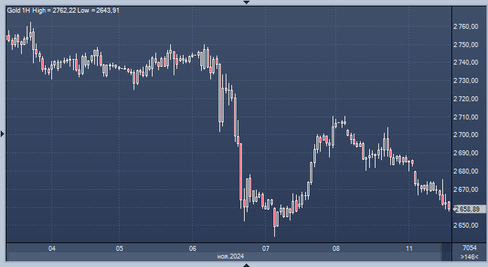 Аналитик уверен, что ФРС будет осторожна в снижении процентных ставок. На этой неделе ожидается выступление Джерома Пауэлла из ФРС, а также данные по потребительским и промышленным ценам в США. График цены наличного золота интервалами в 60 минут Стоимость золота снизилась на 0,8% во вторник, 11 декабря, на фоне укрепления американской валюты и растущего желания рисковать. Это связано с тем, что рынки ожидают осторожных действий Федеральной резервной системы под руководством избранного президента США Дональда Трампа. По состоянию на 11:12 по Гринвичу спотовое золото подешевело до 2 662,59 доллара за унцию, что на 0,8% ниже предыдущей цены. Фьючерсы на золото в США также снизились на 0,9%, до 2 669,40 доллара. «Снижение цен на золото обусловлено прежде всего укреплением доллара США, ростом доходности казначейских облигаций и повышением склонности инвесторов к риску на финансовых рынках. Эти тенденции усилились после победы Дональда Трампа на президентских выборах на прошлой неделе», — от