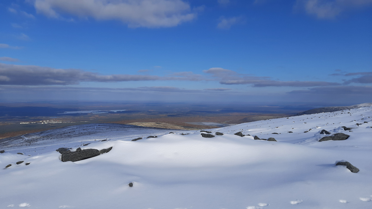 Очень повезло с погодой, с перевала виды во все стороны - на Хибины, Ловозеро, Ревду - открылись. В тумане или в снегопад здесь было бы не так приятно находиться, да и опасно. Но Хибины, спасибо им, нас "пустили" и показались во всей красе.