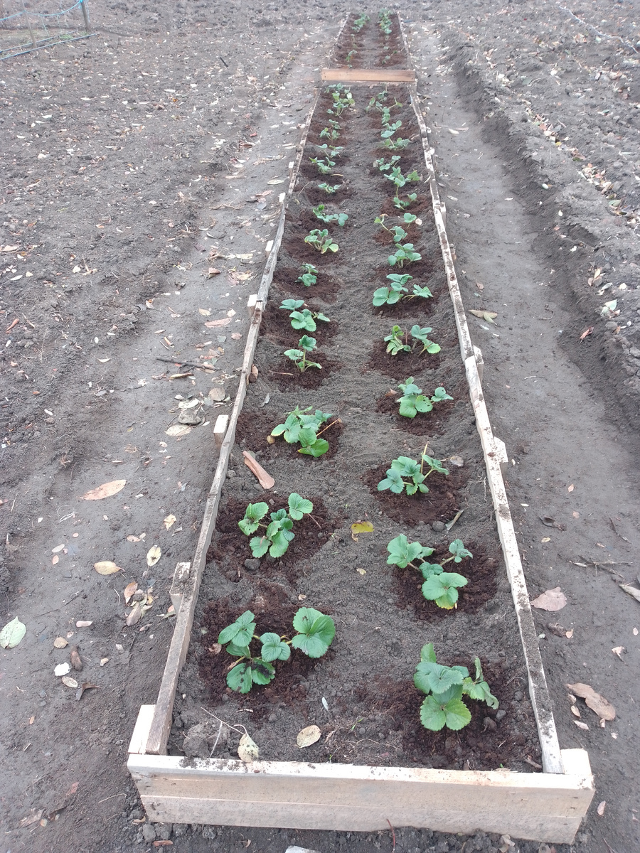 Выходные получились плодотворные), наконец-то высадила саженцы клубники, точнее сделала перевалку на постоянное место. Саженцы приобрела месяц назад, но место под них ещё не было готово, поэтому пришлось высадить в стаканчики, за это время они хорошо укоренились, корешки вышли к стенкам, а теперь и вовсе на грядке воля вольная, еще месяца полтора крепких морозов не будет, успеют прижиться на новом месте. Последние четыре года в семье были проблемы со здоровьем, за это время без должного ухода кое-что пропало, теперь восстанавливаем постепенно, высадили четыре сорта малины, вот еще и клубники шесть сортов, и своих кустиков немного выжило. Виноград Молдова без обрезки заплел всю арку, и дал большой урожай в этом году, еле справились, запаслись соком, вином, и чачу тоже сделали), как же без неё 😉, а чем закусить, найдётся и в подвале, и морозилку заполняем сейчас, привыкли к своим продуктам. Золотой осени у нас давно уже не было, листья на деревьях зеленые, после ночных заморозков, падают на землю, жухнут, становятся коричневые, не красиво. Климат поменялся, помню в школьные годы ходили в парк собирали огромные букеты из осенних листьев, а вокруг такая красота разноцветная, от всех оттенков желтого до розовых, багровых девичьего винограда. Зима была снежная, лето с теплыми дождями, все росло само без полива, без всяких обработок, а вот теперь чтобы что-то вырастить, надо поднапрячься.