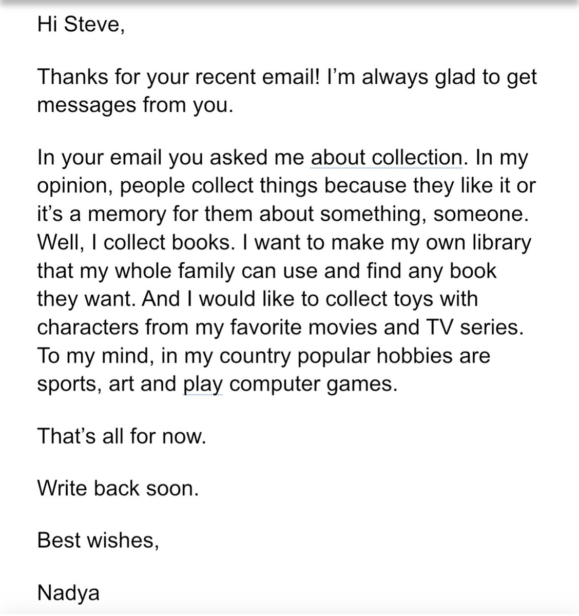 "Хочется, чтобы результат на экзамене был выше? В этой статье я подробно разберу пример письменного задания, покажу, как оцениваю работы по критериям ОГЭ, и расскажу, на что стоит обратить внимание. Прочитайте анализ, чтобы понять, как улучшить свой текст, и узнайте о моей услуге проверки письменных работ!" У нас вот такое задание: You have received an email message from your English-speaking pen-friend Steve: From: Steve@mail.uk To: Russian_friend@oge.ru Subject: Collecting things … My elder brother has decided to collect mugs, imagine that. It’s a nice collection but it takes up so much room. …Why do people collect things? What do you collect or what would you like to collect? What other hobbies are popular with teenagers in your country? … Write a message to Steve and answer his 3 questions. Write 100–120 words. Remember the rules of letter writing Работа моей ученицы Давайте оценим этот email и внесём необходимые изменения. Оценка по критериям: Решение коммуникативной задачи (3