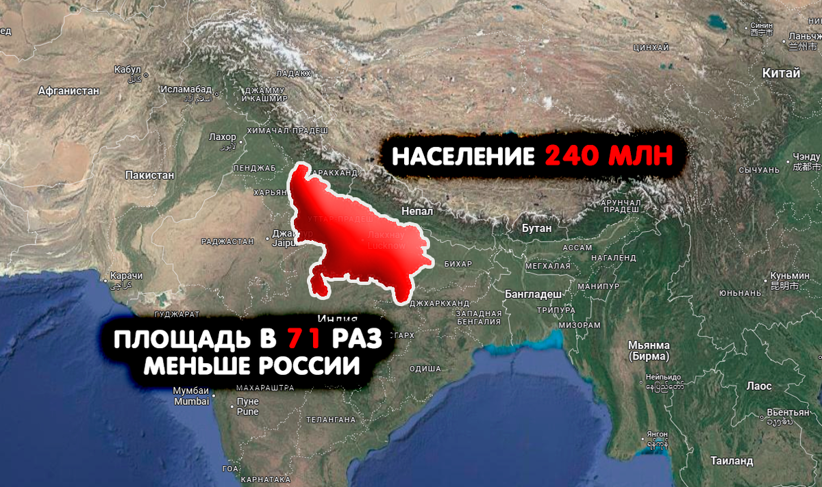 Маленький регион на юге Азии площадью всего в 240 928 км² — это площадь двух Кировских областей России. А теперь представьте, что на этой территории живёт в 1,5 раза больше людей, чем во всей России! Интересно, что этот регион удивляет не только своими масштабами, но и богатой историей и культурой. Речь пойдет о регионе Уттар-Прадеш — крупнейшем по населению штате Индии. Так, ещё в 2011 году население Уттар-Прадеша составляло почти 200 миллионов человек, а к 2023 году оно достигло аж 241 миллиона. Да уж, такие цифры впечатляют — это население 3 Германий, 4 Франций. А ведь это всего лишь один из штатов Индии. Уттар-Прадеш расположен в самом сердце Индии и граничит с Непалом на севере, а также с другими индийскими штатами. Его география столь же разнообразна, как и культура. На севере простираются величественные Гималаи со снежными вершинами, а на юге — холмы Видхья, добавляющие особый шарм ландшафту. Между ними раскинулась плодородная Индо-Гангская низменность, питаемая реками Ганг и
