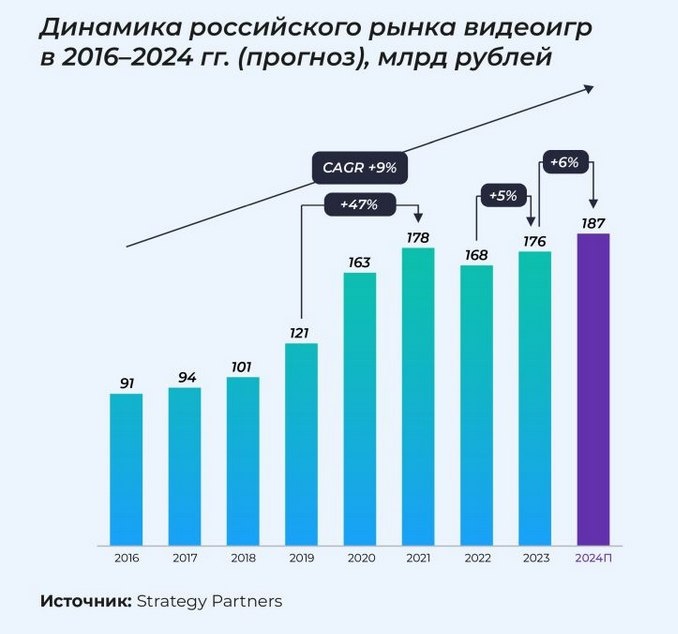- Рост рынка видеоигр в России впечатляет. Он быстро растет. По данным онлайн-школы геймдева XYZ School, российские геймеры потратили на игры ₽49 млрд за 1к 2024 г., ₽54 млрд – за 2к и ₽65 млрд за 3к. При этом объем всего рынка может достичь ₽187 млрд в этом году – это на 6,1% больше показателей 2023 г.