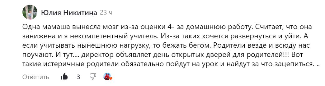Вчерашний пост вызвал бурное обсуждение. Тема сложная и актуальная, судя по комментариям.Обсудим)) Начало читайте здесь- Проблема в том, что обе взрослые стороны считают себя правыми, и родители, и учителя. Почему так происходит. И почему мы не можем понять друг друга, попытаемся разобраться вместе. Пишут с возмущением учителя, потому как они не понимают, почему ученик сам не умеет учиться и понимать, почему ему поставили не ту оценку, которую он думал получить. Значит, что-то было не так в ответе или в работе? Ещё и родители есть такие, которые будут выяснять подробно, что и как на уроке было. И порой у учителя, а не у своего ребёнка. Вот пишет Юлия Никитина- Подробно и спокойно можно спросить у ребёнка и не возводить это в огромную трагедию. Но накладок бывает много. Нагрузок у учителей тоже много. Да и человеческий фактор никто не отменял. Он тоже есть. Вот спрашивает Татьяна Петрова- Вспоминаю одну мамочку. Дочь училась уже в 7 классе. Она звонила, потом приходила и спрашивал