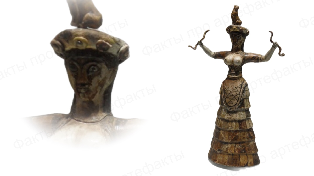Среди наиболее значимых экспонатов и знаковых символов минойской культуры две изысканные скульптуры, известные как "Богини змей", представляют собой превосходный образец минойского искусства. Эти скульптуры являются частью коллекции, включающей в себя в общей сложности шесть или семь аналогичных фигурок, и, как полагают, изображают подземную минойскую богиню змей. Наряду с другими религиозными или церемониальными предметами они использовались в центральном храме Кносского дворца, организованном комплексе зданий религиозного назначения в западном крыле дворца. После разрушения этого района около 1600 года до н.э. предметы были помещены в качестве сокровищ в углубления в форме шкатулок в сокровищнице храма, которые были запечатаны перед реконструкцией и повторным использованием храма на следующем этапе его истории. Статуэтки изготовлены из раскрашенной глины. Различные их части были изготовлены по отдельности в формах и соединены проволокой. Женские фигуры, которые изображены на них, и