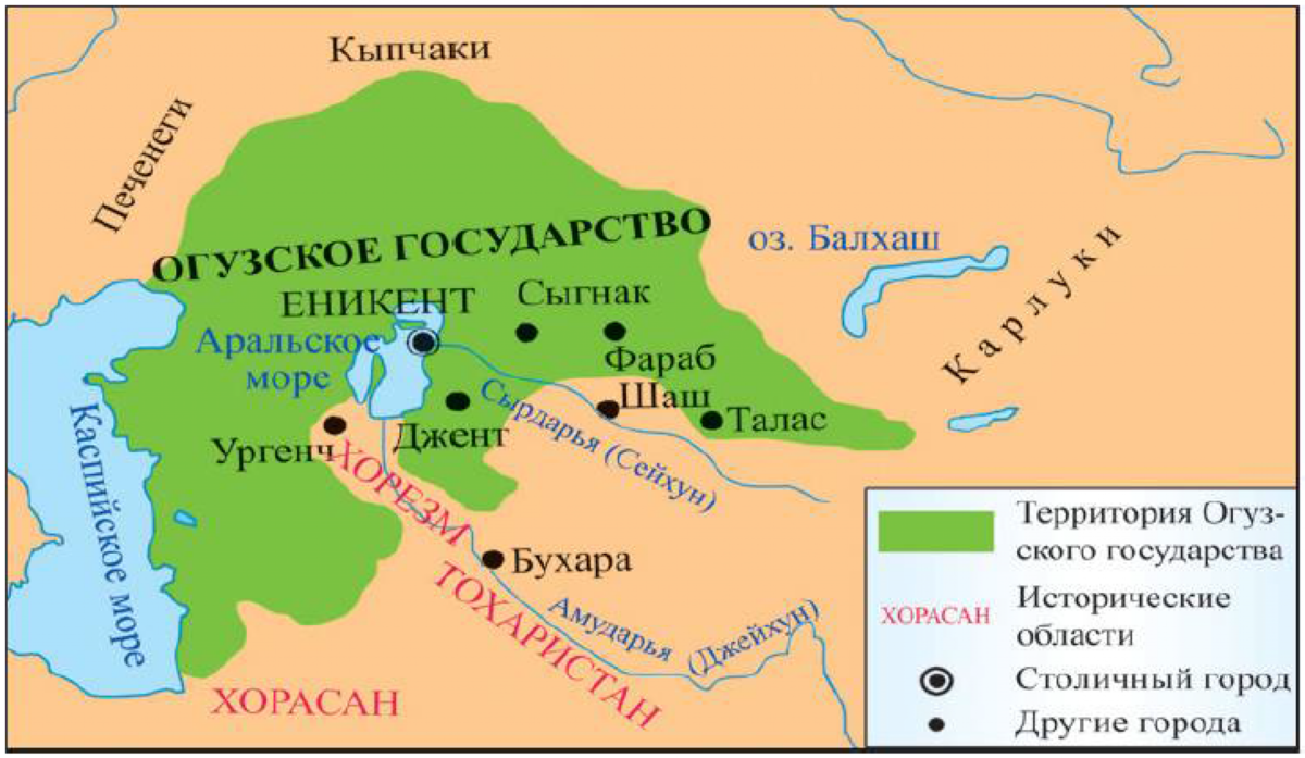 Огузы – это одна из крупных средневековых тюркских конфедераций. Изначально их предки были в составе Уйгурского каганата, но постепенно откочевали на запад и заняли степи к востоку от Каспия в 8-м веке н.э. Здесь они ассимилировали кочевое скифо-сарматское и угорское население и создали государство огузских ябгу – этот титул был вроде ханского.