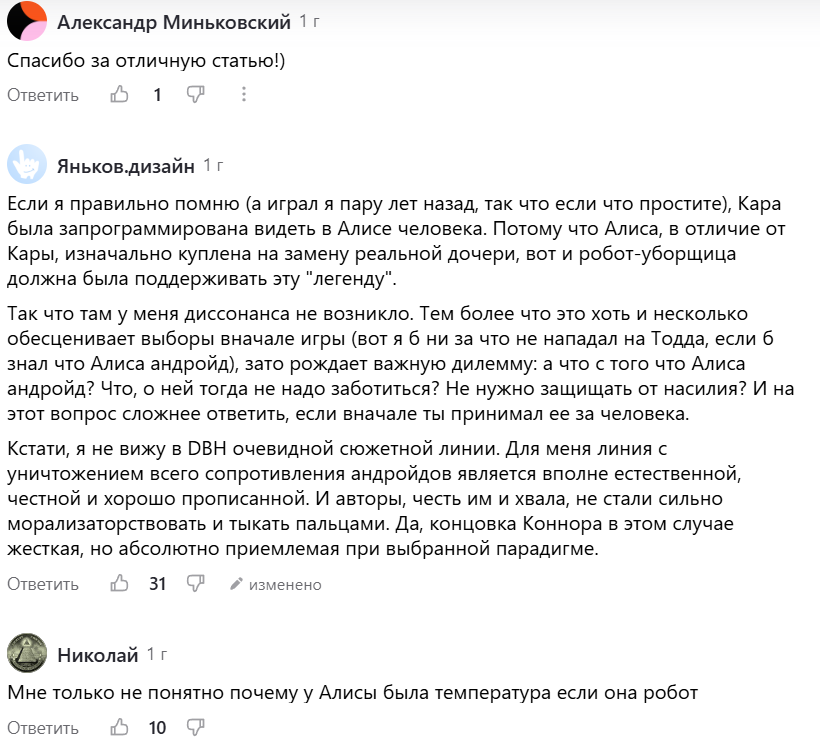 И что там дальше в комментариях? Вопрос о пропущенном моменте из игры, два рассказа о своих впечатлениях с плюсами и минусами, два полностью положительных коммента об игре, четыре коммента с критикой игры, три коммента, несогласных конкретно с посылом статьи, и два комментария, которые пытаются гиперболизировать всё до "бунта микроволновок" (ничего не имею глобально против такой позиции, хотя, конечно, любопытно, как компьютерные персонажи, изображающие людей, вызывают больше симпатии, чем компьютерные персонажи, изображающие андроидов, но это больше любопытство, от того, чтобы всерьёз судить человека по его поступкам в игре я максимально далёк).