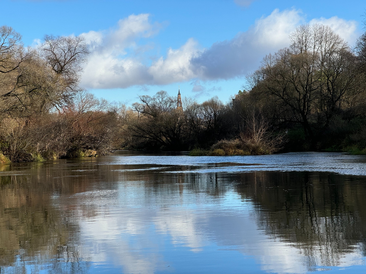 Осенний день радует своим неожиданным светом и теплом. Еду свой любимый маршрут вдоль реки Нара. Зеркальная гладь реки отражает голубое небо с белыми облаками и темные деревья растущие вдоль берега. Песчаная речная коса с мелководьем и островками отдыхает от летнего наплыва местных жителей. Лесная дорога благоухает сосновом ароматом и немного усложняет езду вязкой песчаной колеей. И вот у меня наконец-то появился реальный шанс проверить внедорожные возможности велосипеда и немного помесить грязь. Чуть забуксовал, но прорвался! Снова берег Нары радует своим красивым живописным видом. На высоком холме над рекой возвышается старинный полуразрушенный храм. А я вполне накатался и зарядился природной энергией! Пора домой. 02.11.2024
