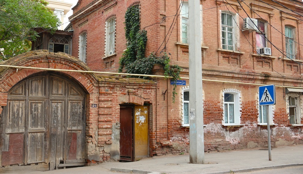 Рабочие «Астрводоканала» серьёзно повредили входную группу памятника архитектуры регионального значения «Усадьба Горюшкиной Т.В. (Помазана М.Г.)», построенного на рубеже XIX-ХХ веков. После судебных разбирательств утраченный элемент исторического здания восстанавливают. Кроме кирпичного свода и оснований арки там имелись аутентичные деревянные ворота, нуждавшиеся в реставрации. К сожалению, частенько утраченные исторические детали старинных зданий в Астрахани исчезают бесследно и вместо них появляется непонятно что. Интересно, как сложится судьба деревянных ворот с Фиолетова?