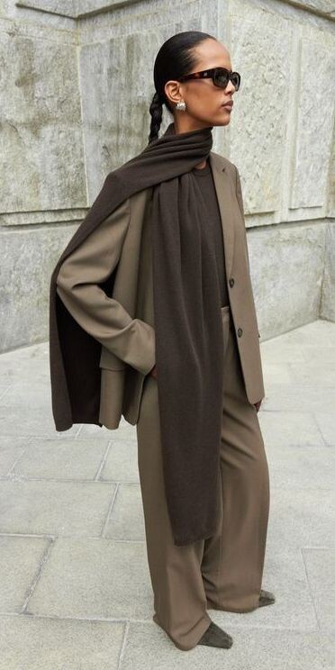 Еще один способ улучшить простой вид (например, тон в тон) - использовать различные текстуры и цветовые нюансы. Внешний вид остается минималистичным, но интересен различными материалами и цветовыми градациями. Например, можно сочетать светло-серый, мягкий, объемный кардиган (т. е. очень мягкую вещь как по материалу, так и по фасону) с очень структурированной темной шерстяной юбкой, которая прекрасно держит форму колокол (т. е. довольно строгую) и этот прием хорошо работает. Можно добавить также черные лакированные лоферы, которые дополняют сочетание цветов и текстур.