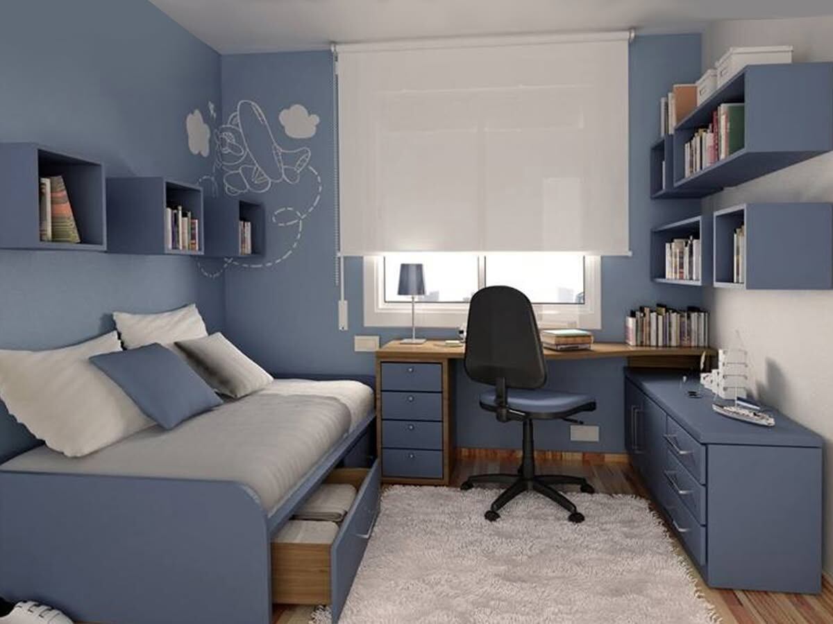 В небольшой комнате помогут компактные решения. Например, кровать с выдвижными ящиками для хранения, раскладной диван или стеллаж, который можно использовать и как книжный шкаф, и как разделитель комнаты. - Шкафы и системы хранения