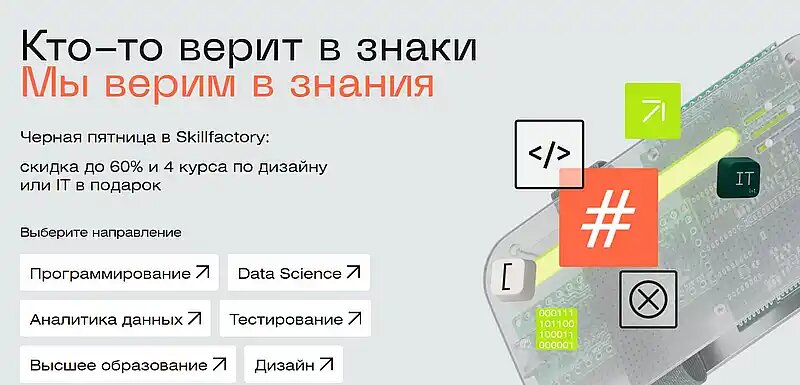 Ведущая онлайн-школа Skillfactory запускает масштабную акцию к «Черной пятнице», которая продлится весь ноябрь. Под вдохновляющим слоганом «Кто-то верит в знаки, мы верим в знания» школа предлагает беспрецедентные условия для всех, кто хочет получить качественное образование в сфере IT и дизайна. С 1 по 30 ноября 2024 года на все основные курсы Skillfactory действуют существенные скидки: