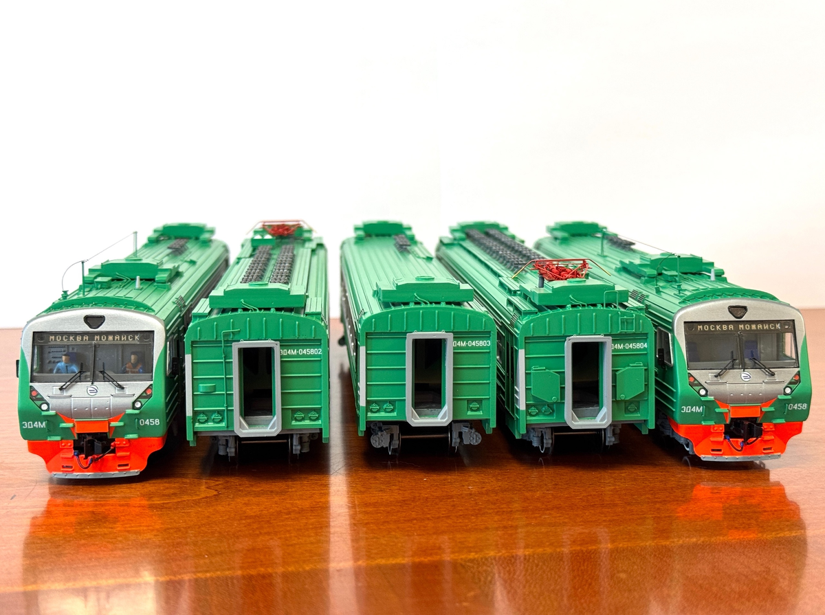 Представляю Вашему вниманию очередную новинку, собранную Степаном Мажугой, - модель электропоезда ЭД4М-0458. Модель изготовлена в масштабе 1:87 (типоразмер Н0). Состав из пяти вагонов (Г-М-П-М-Г) собран из КИТа производства Ильи Бушнева. Касаемо модели. Из проволоки диаметром 0,3 мм сделаны трубки, идущие к токоприемникам, и закреплены при помощи рым-болтов от мастерской "АртМодель". Стойки КВ антенны сделаны из латунного прутка диаметром 0,6 мм.