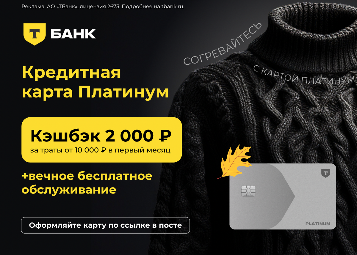 У Т-Банка снова акция по кредитной карте Platinum: если заказать карту по специальной ссылке и потратить 10000 рублей в первый месяц, банк подарит 2000 рублей, а выпуск и обслуживание карты будут бесплатными. Карта бесплатно доставляется по всей России (во многих городах приезжает представитель банка, в остальных случаях карту пришлют Почтой России). Заемными деньгами можно пользоваться совершенно бесплатно, если успевать возвращать потраченные деньги во время льготного периода (в приложении видно до какого момента нужно полностью погасить задолженность). Картой можно оплачивать покупки, но не стоит снимать деньги в банкоматах и переводить с неё деньги (на снятия денег и переводы льготный период не действует). У карты есть кэшбэк 1% баллами, которые можно потратить на компенсацию покупок в категориях «Рестораны и Фастфуд» и «ЖД-билеты». Дополнительный повышенный кэшбэк до 30% можно получить за покупки у партнёров, которых достаточно много в разных областях. Обычно обслужив