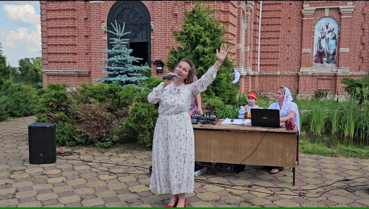 К Дню Рождения Натальи Родионовой. Концерт Натальи Родионовой, Лизы и Виталия Мазаевых после богослужения у храма Рождества Христова. Фото из архива. Июль 2024 года. Село Мокрый Корь. Ясногорский район Тульской области.