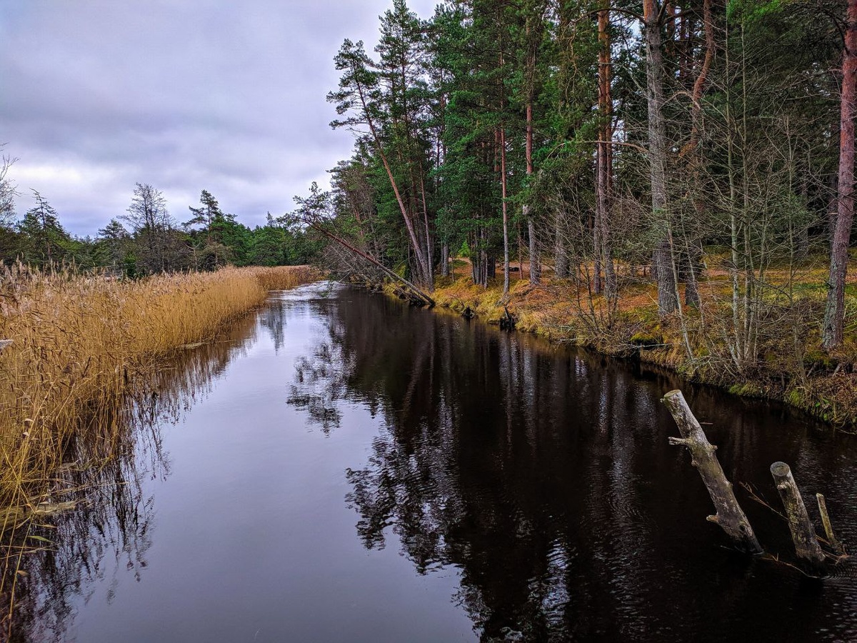 Пару дней назад мы добрались до Усть-Луги, прошли несколько километров между стройных рядов вековых елей, посмотрели, как река Выбья, заросшая тростником, впадает в Финский залив, посидели на пустынном берегу, любуясь идиллическими осенними пейзажами. Затем забрались на смотровую площадку, чтобы обозреть всё тоже самое, но уже с высоты трехэтажного дома. Экологическая тропа, которую без труда можно отыскать на карте, находится на территории заказника «Кургальский» в Кингисеппском районе Ленинградской области. Уникальность этого маршрута заключается в сочетании разных ландшафтов и экосистем, чередующихся на небольшом отрезке пути. Тропа начинается на парковке с информационными стендами и сперва идет через высокий сосново-еловый лес. Несмотря на выходной другие путники нам почти не встречались, а тишина стояла такая, что порой становилось не по себе. Основная часть маршрута (4,3 км) проходит по берегам реки Выбья, которая отделяется от реки Луги в 6 км от ее впадения в Финский залив. Пра