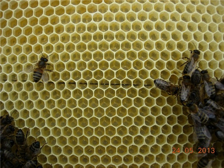 Все просто, брюхо не такое большое, они не достают до дна ячейки. Поэтому откладывают они яйца по стенкам ячейки, не в центре и с большими пробелами. Причем их количество может быть даже больше 5 штук.