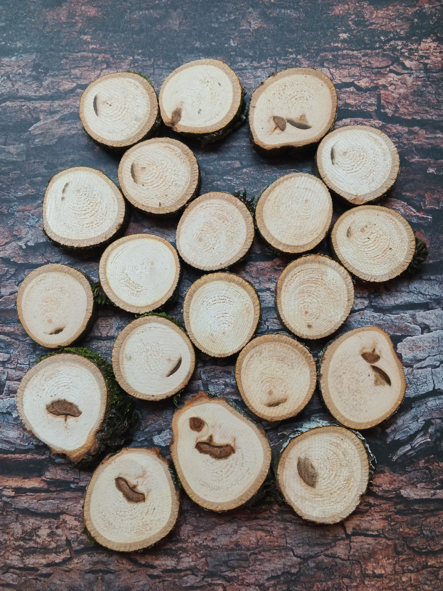 На днях напилили липу на спилы. В каждом наборе по 20 спилов. Диаметр от 3 до 5 сантиметров. Толщина около 10 миллиметров. По бокам может быть зеленый мох;) Купить такие спилы липы можно в нашем магазине на сайте Озон