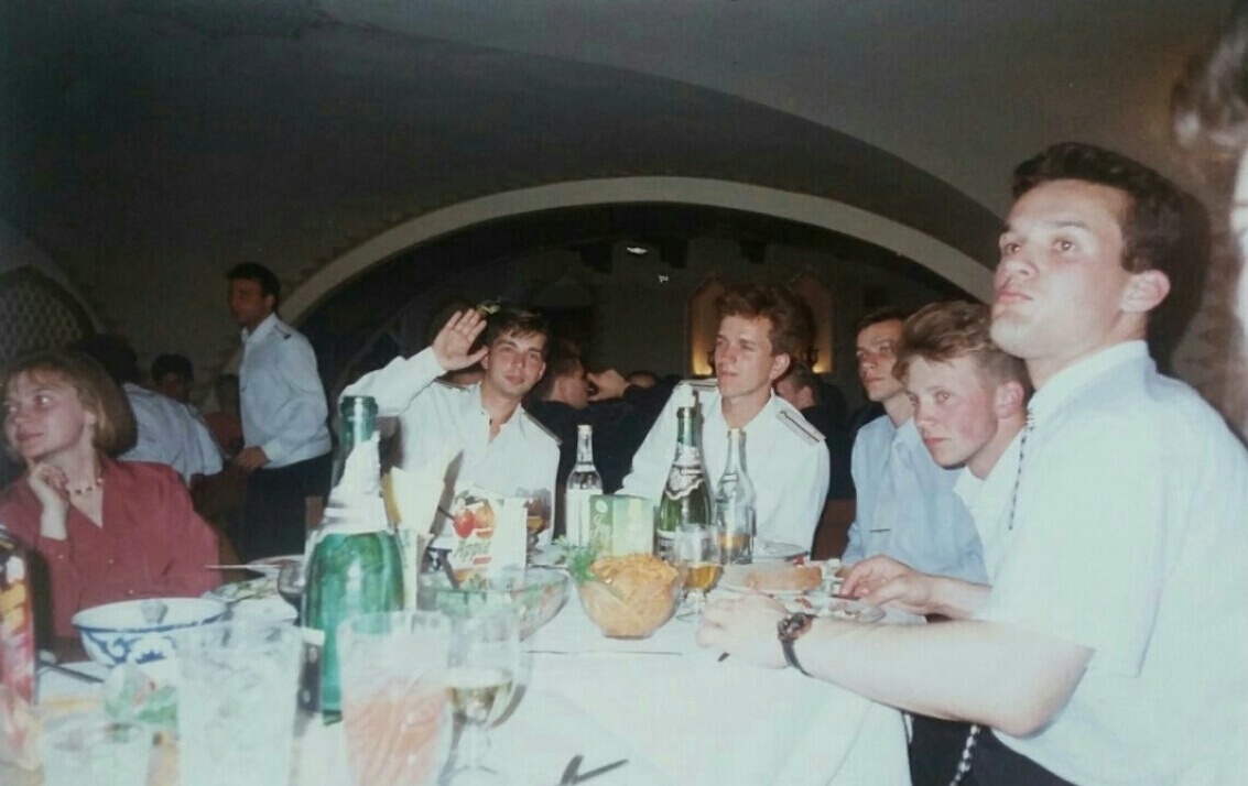 ПРО ФОТО: вчера был отдых во время учёбы, а сегодня конец учёбы, выпускной, который отмечаем в ресторане Санкт-Петербурга, рядом с Эрмитажем, Зимним дворцом и Дворцовой площадью. На улице Белая ночь, то есть тот же день, что-то среднее между ранними сумерками и поздним светанием. В обед торжество по поводу появления на плечах лейтенантских погон, в полночь праздник по этому поводу. На сцене выступали, пели, веселили как видите. Водка, шампанское, коньяк лились рекой. 1996-й. Папа и другие родители отметили своим присутствием начало дела и благоразумно удалились. Всё прошло хорошо, Бог покрыл Своей милостью, потому враг не приблизился. Отцы просили - как отказать? Сам Отцом является, коллеги. Кто снимал на фотокамеру, не знаю. Вот ещё одно
