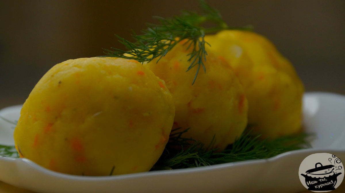 Ингредиенты: · картофель – 1, 5 кг.; · лук – 1 шт.; · морковь – 1 шт.; · соль – ½ ч.л.; · сыр – 100 гр.; · масло для пассерования. Приготовление: лук мелко порезать и морковь потереть на терке, спассеровать. Картофель отварить, слить воду, 1 стакан оставить. Размять картофель толкушкой, постепенно влить бульон, довести густоту пюре до желаемой консистенции. Добавить обжаренные овощи, посолить. Сыр натереть на мелкой терке, по частям ввести в пюре, тщательно перемешивая. Скатать шарики, подавать с зеленью. Приятного аппетита!