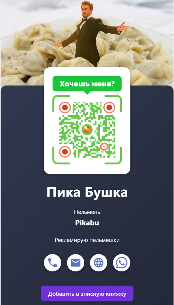 Сделать такую можно на любом из сервисов визиток или некоторых генераторах QR кодов с визитками. Обратите внимание, что QR коды при этом должны быть динамические. На личном опыте - конверсия и запоминаемость выше, если не просто давать визитку, а просить её отсканировать. Сохранить данные можно всегда одной кнопкой в записную книжку.