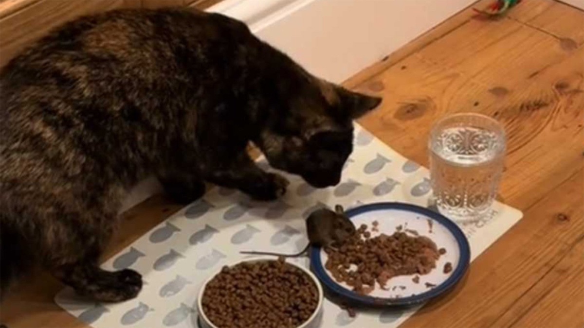 Когда кот по кличке Чуи принес домой мышь, его хозяйка Эбби и подумать не могла, что вместо того, чтобы поиграться с грызуном, удовлетворив свои охотничьи инстинкты, питомец решит накормить «добычу» из собственной миски. Девушка не могла упустить такой момент и сняла происходящее на видео, которое сразу же стало популярным. В кадре мышь выскользнула из-под телевизора и уверенно направилась к миске Чуи. Сам же кот вместо того, чтобы вступить в игру хищник-жертва, расслабленно наблюдал за грызуном. «Ну раз ты уже тут, угощайся!» — решил питомец. Специалисты из компании по производству корма «Purina» комментируют, что коты часто приносят добычу домой. Иногда для того, чтобы порадовать хозяев.