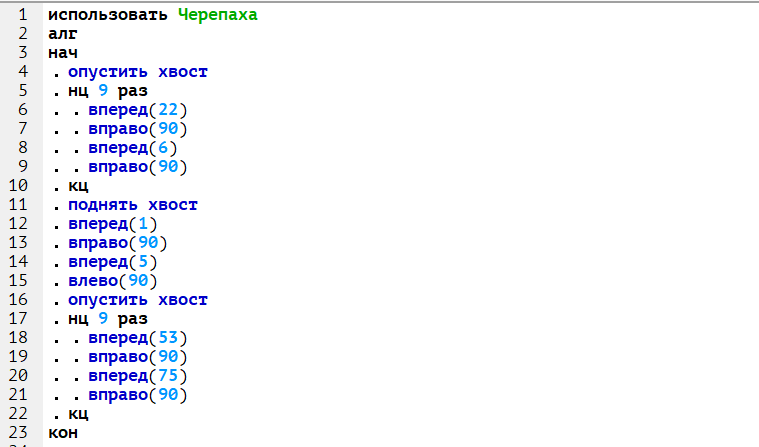 Исполнитель Черепаха действует на плоскости с декартовой системой координат. В начальный момент Черепаха находится в начале координат, её голова направлена вдоль положительного направления оси ординат, хвост опущен. При опущенном хвосте Черепаха оставляет на поле след в виде линии. В каждый конкретный момент известно положение исполнителя и направление его движения. У исполнителя существует 6 команд: Черепахе был дан для исполнения следующий алгоритм: Повтори 9 [Вперёд 22 Направо 90 Вперёд 6 Направо 90] Поднять хвост Вперёд 1 Направо 90 Вперёд 5 Налево 90 Опустить хвост Повтори 9 [Вперёд 53 Направо 90 Вперёд 75 Направо 90] Определите периметр области пересечения фигур, ограниченных заданными алгоритмом линиями. У нас получается фигура 21*1. Считаем периметр 21+21+1+1 = 44. Ответ: 44. Посмотреть как решается задание 7 можно здесь. Весь курс подготовки к ЕГЭ с подробными описаниями и комментариями. Лайки и комментарии приветствуются.