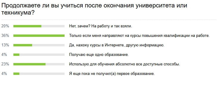 В проходившем на сайте DVHAB.ru опросе мы спрашивали у хабаровчан, продолжают ли они учиться после того, как уже получили высшее образование. 36% заявили, что занимаются дополнительным обучением только в том случае, если их по работе отправляют на курсы повышения квалификации. 23% стараются использовать для обучения все доступные способы. 20% честно признались, что им это просто не нужно, ведь у них уже есть работа. 13% ищет специализированные курсы в сети Интернет и иных источниках. 4% прямо сейчас получают еще одно образование и еще 4% еще пока не получили первое. Отметим, что на главной странице DVHAB.ru каждую неделю проводятся опросы на самые актуальные и острые темы. Найти вы их можете, пройдя по ссылке. Напомним, Тихоокеанский государственный университет и Дальневосточный государственный медицинский университет вошли в новый рейтинг вузов стран БРИКС. В списке участвуют 600 учебных заведений из десяти государств.