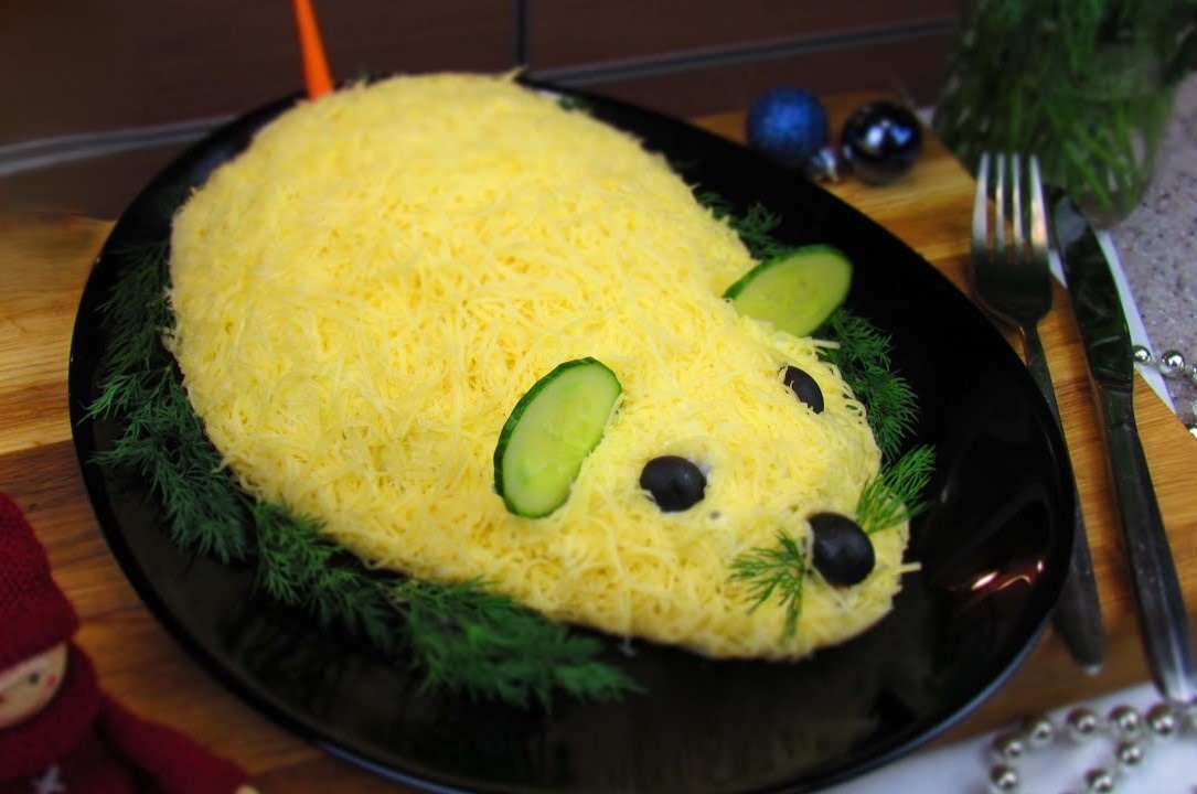 Салат выложите на блюдо в форме мыши. Украсьте салат тёртым сыром, чтобы создать эффект мышиной шерсти. Добавьте глазки и носик из маслин или других подходящих продуктов.