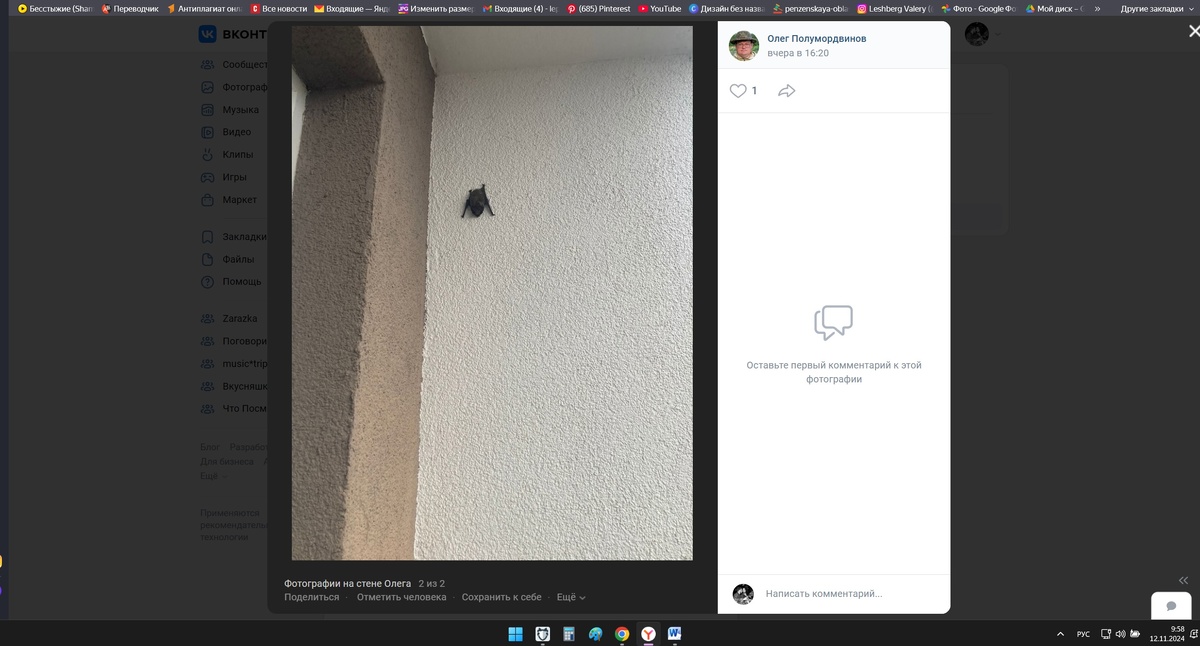 Эксперт опубликовал на своей странице «Вконтакте» в качестве примера фото небольшой черной летучей мышки, сидящей на стене. По его словам, она залетела ночью на один из Арбековских балконов.