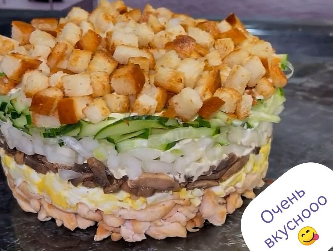 Пора, друзья, пора. Выбирать рецепты, сохранять их, писать список продуктов. Я очень давно не делилась с вами рецептами в формате статьи. Почему бы и не возобновить традиции и не пополнить нашу подборку "Еда и вода". Вот такой салат будем готовить: Список продуктов: 500 гр. куриного филе Свежий огурец Лук (можно салатный сиреневый, можно белый) Шампиньоны 300 гр (можно чуть больше, если очень любите грибы) Яйца, штуки 3-4. Если С0, то 3. Список для гренок: белый хлеб, батон растительное масло чеснок (1-2 зубчика) специи Куриное филе нужно порезать соломкой и хорошо обжарить. Соль и перец во время жарки нужно добавить по вкусу. Лук для этого салата лучше замариновать: порезать на мелкие кубики, взять половину чайной ложки сахара, классическую вашу щепотку соли, 9% уксус 1 чайную ложку и примерно 2 столовых ложки воды. Хорошо перемешать лук в маринаде и подождать 20 минут. Можно к луку добавить очень мелко порезанную зелень. Далее режем огурец и варёные яйца, лучше резать в