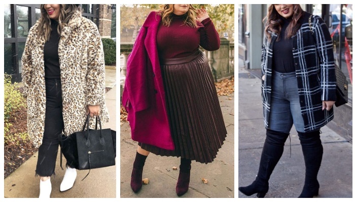 В данной статье мы подобрали актуальные образы для пышных красавиц на холодную осень. Продолжайте читать, сейчас мы рассмотрим примеры удивительных нарядов, которые помогут сделать эту осень запоминающейся для каждой из вас. Пальто в клетку - отличный выбор верхней одежды, который прекрасно сочетается с повседневными водолазками, джинсами скинни и замшевыми сапогами на невысоком каблуке. Дополнительными элементами этого образа будут стеганый клатч и кепи в нейтральном черном цвете. Стильный осенний look в бежево-белой цветовой гамме получилось составить с помощью бежевого пальто свободного кроя, белого трикотажного лонгслива, светлых джинсов с потертостями, нюдовых остроносых ботильонов на каблуке, а также каркасной сумки с короткой ручкой. Перед вами наглядный пример элегантного образа с принтованным миди платьем в нежный цветочный принт, голубым пальто, а также замшевыми ботфортами комплементарного винного оттенка. Для создания уютного и теплого осеннего образа стилисты использовали