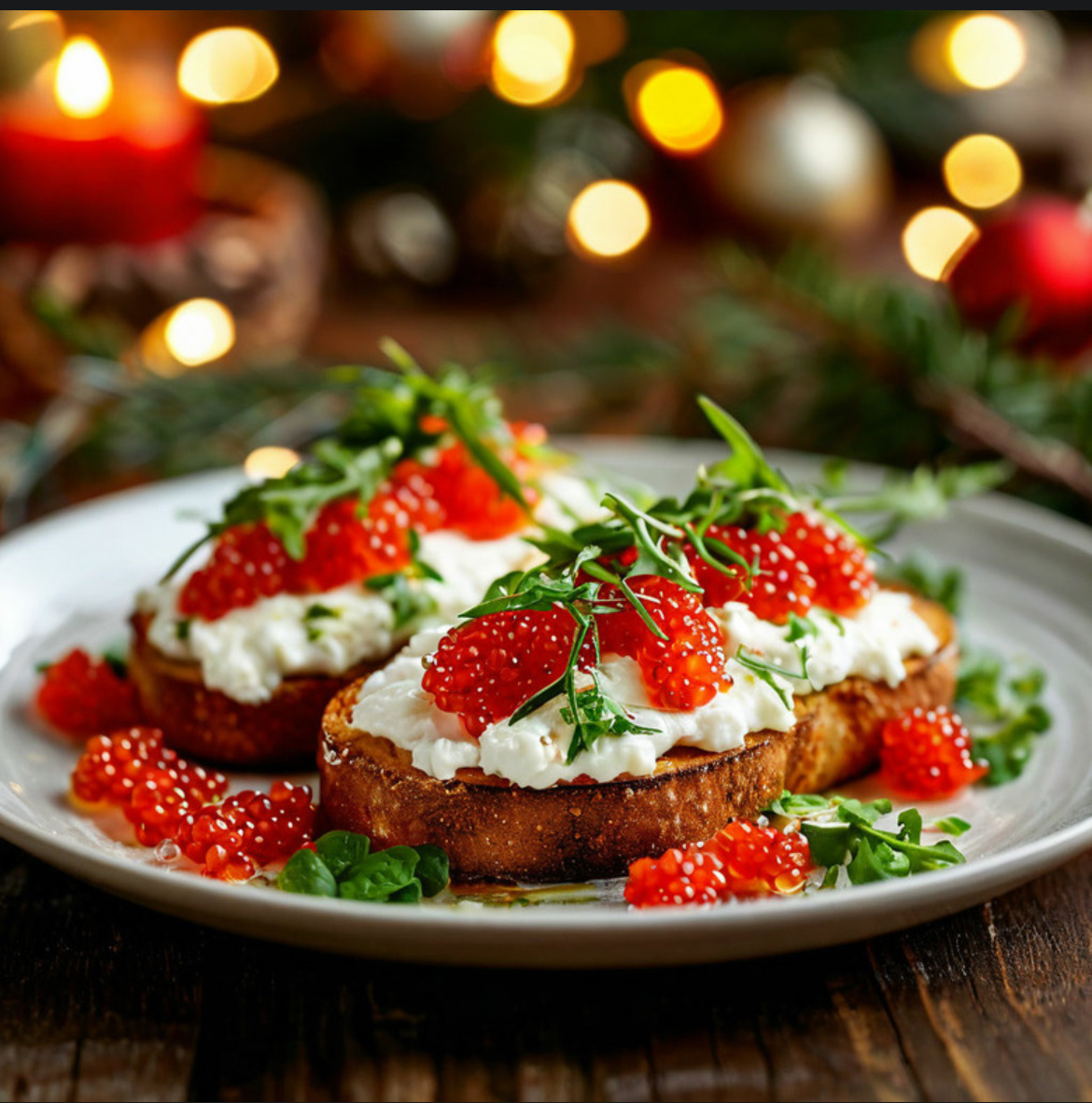 - На остывший багет намазать сливочный сыр, добавить чайную ложку красной икры, сверху микро зелень.