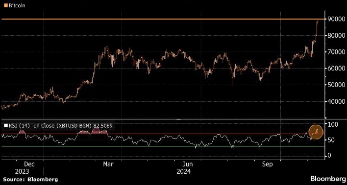 Рекордный рост цены биткоина поднял этот флагманский цифровой актив выше 89 000 долларов, что привело к росту общей капитализации рынка криптовалют выше пика пандемии, поскольку трейдеры делают ставку на ралли при избранном президенте Дональд Трамп.