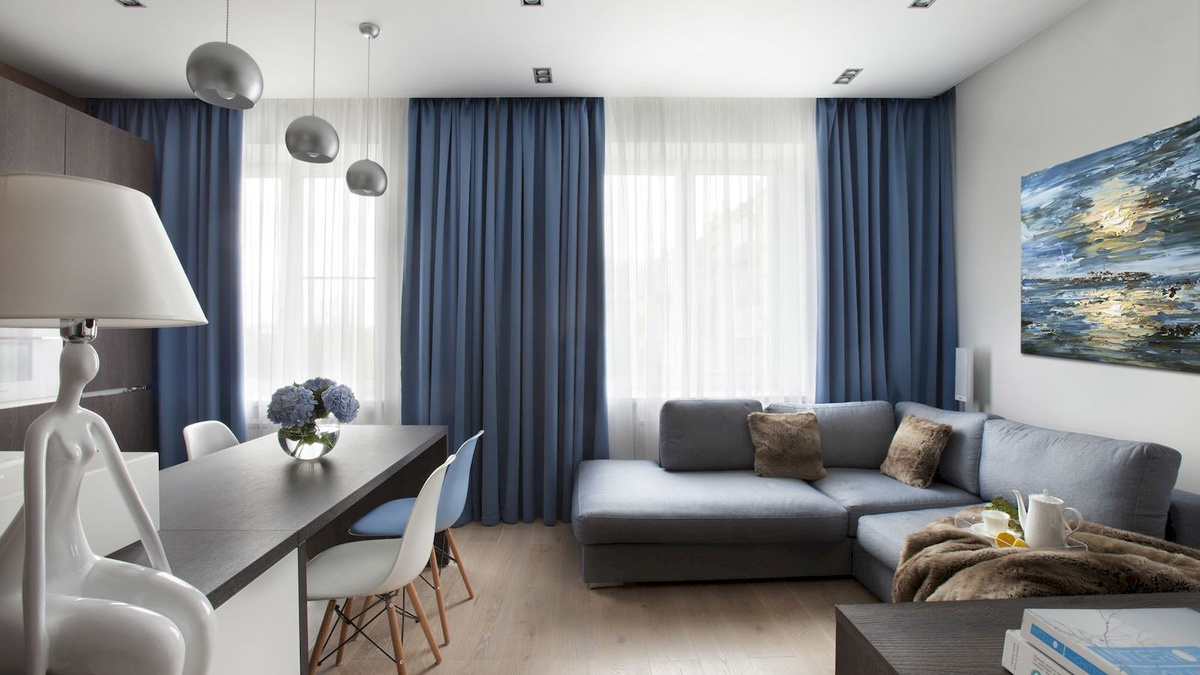 Если квартира декорирована в нейтральных красках, белой, бежевой или серой, то синие гардины станут для нее чудесным дополнением. Мы предлагаем добавить в такие апартаменты хотя бы пару-тройку предметов, сходных по тону. Это могут быть декоративные подушки, плед, маленький коврик, скатерть, рамки для фотографий, искусственный цветок, либо заново обшитая темно-сапфировым велюром мягкая мебель. Именно так и поступили заказчики этого проекта – заказали новую обивку на диван и плотные бархатные шторы с тюлем в нашем салоне.