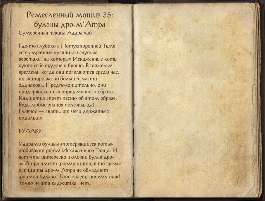 Сумеречная певица Адара'хай Где-то глубоко в Потусторонней тьме есть мрачные кузницы и гнутые верстаки, на которых Искаженные коты куют себе оружие и броню. В тяжелые времена, когда они появляются среди нас, их экипировка по большей части одинакова. Предположительно, они придерживаются определенного образа. Каджитка споет песню об этом образе. Ведь любые знания полезны, да? Главное - знать, от чего держаться подальше. Информация и иллюстрации взяты из клиента игры The Elder Scrolls Online. Навигатор по статьям канала. БУЛАВЫ Ударами булавы "потерявшиеся коты" отбивают ритм Искаженного Танца. И вот что интересно: головки булав дро-м'Атра имеют форму щита, в то время как щиты дро-м'Атра не обладают формой булавы! Кто знает, почему это так? Точно не эта каджитка, нет. КИНЖАЛЫ Кинжалы дро-м'Атра - это короткое колющее оружие с очень сильно искривленной гардой, которая должна помочь при парировании. Как ни странно, на кинжале изображена всего одна убывающая луна, тогда как на большинстве др