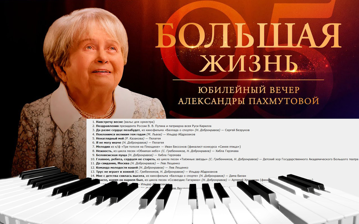 Несмотря на то, что некоторые номера я раскритиковал. концерт безусловно хорош и наверняка станет одним из самых ярких событий 2024 года в российской культурной жизни. Жаль конечно что большинство самых ярких исполнителей песен Александры Николаевны Пахмутовой не дожили до этого дня, но мы их всех помним и любим. Как помним и любим соавторов всех этих песен: Николая Николаевича Добронравова и Сергея Тимофеевича Гребенникова . А вот и обещанные ссылки на статьи о А.Н.Пахмутовой: