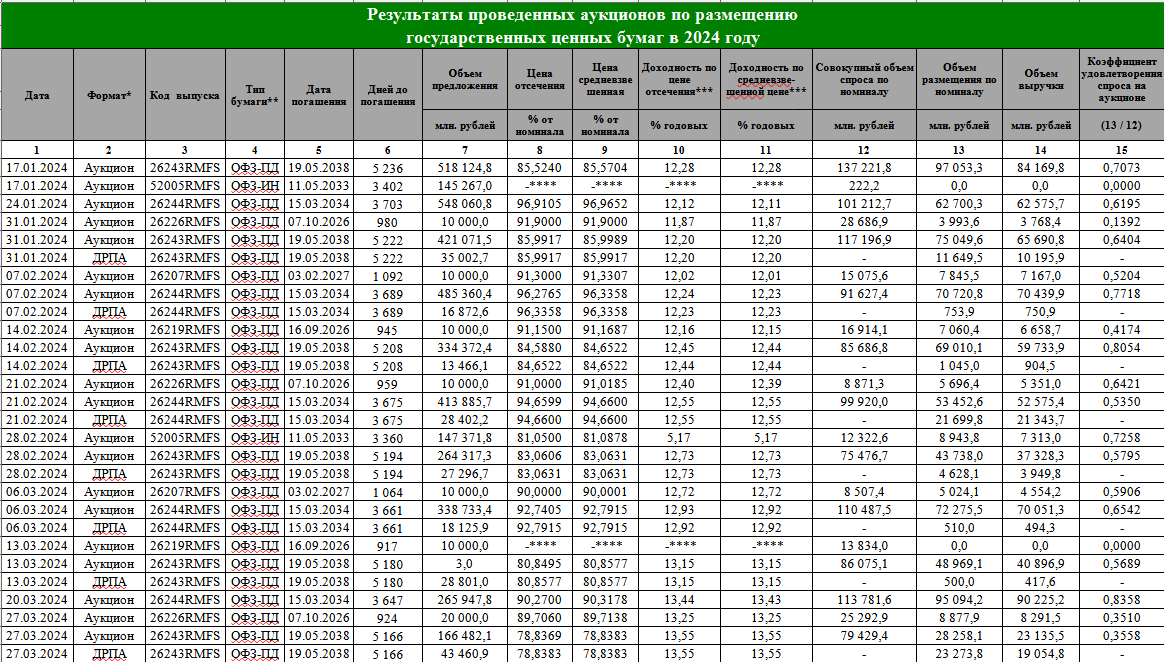 За девять месяцев 2024 года Минфина погасил ОФЗ и выплатил процентов по ним больше, чем привлек с рынка: на 777 млрд. руб. В октябре Минфин проводил аукционы по размещению ОФЗ с переменным успехом. В некоторые дни аукционы были признаны несостоявшимися "в связи с отсутствием заявок по приемлемым уровням цен". При этом зачастую не размещались ОФЗ ПК, цены на которые активные аукционы предыдущих месяцев очень сильно снизили. Подведем итоговый баланс размещения за январь-октябрь. Результаты аукционов: За этот период Минфин выручил на аукционах 1 925 млрд. руб. Выплачены в том же периоде следующие суммы: В январе 204 млрд. руб. В феврале 430 млрд. руб. В марте 220 млрд. руб. В апреле 443 млрд. руб. В мае 172 млрд руб. В июне 204 млрд. руб. В июле 604 млрд. руб. В августе 54 млрд. руб. В сентябре 278 млрд. руб. В октябре 552 млрд. руб. В итоге за десять месяцев при выплатах на 3 166 млрд. руб. и размещениях на 1 925 млрд. руб. дефицит увеличился до 1 240 млрд. руб. В ноябре выплаты по ОФЗ