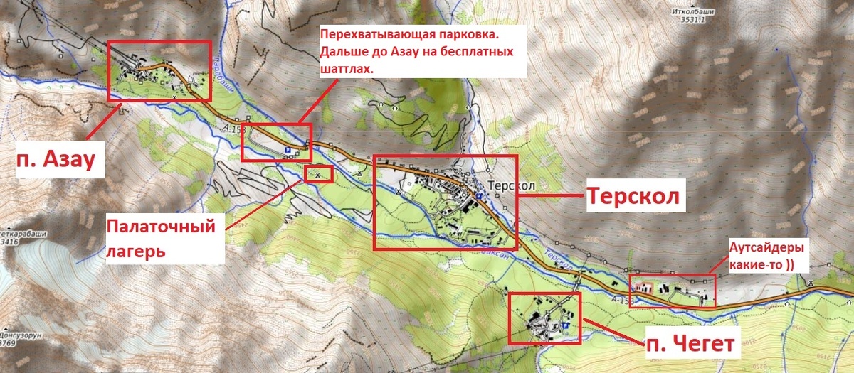 И, хоть они все и кажутся близкими, расстояние между ними великовато. Между Чегетом и Терсколом около 2 км, между Азау и Терсколом 3,5-4 км (смотря как идти, по экотропе или вдоль трассы). И ходить туда-сюда каждый день за хлебушком бывает довольно утомительно. Поэтому лучше заранее подумать, где селиться.